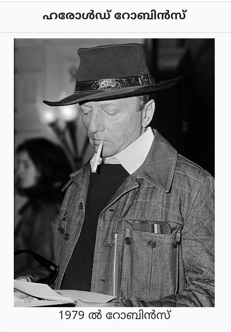 32 ഭാഷകളിൽ 75 കോടിയിൽ അധികം കോപ്പികൾ വിറ്റഴിഞ്ഞ 25 ഓളം കൃതികൾ രചിച്ച പ്രസിദ്ധ അമേരിക്കൻ നോവലിസ്റ്റ് ഹരോൾഡ് റോബിൻസ്