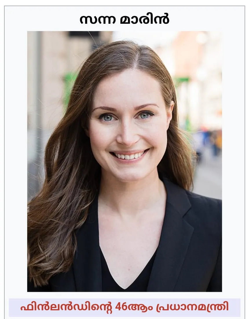 2019 ഡിസംബർ 10 ന് ഫിൻലാൻഡിന്റെ പ്രധാനമന്ത്രിയായിത്തീർന്ന ഒരു ഫിന്നിഷ് രാഷ്ട്രീയക്കാരിയായ സന്ന മിറെല്ല മാരിൻ്റേയും (, 1985)