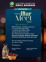 മനാമ: കെഎംസിസി ബഹ്റൈൻ സ്റ്റേറ്റ് കമ്മിറ്റി ഇസ ടൌൺ ഇന്ത്യൻ സ്കൂൾ ഗ്രൗണ്ടിൽ സംഘടിപ്പിച്ച ഗ്രാൻഡ് ഇഫ്താറിൽ ഏതാണ്ട് പതിനായിരത്തോളം പേർ പങ്കെടുത്തു. ഗ്രാൻഡ് ഇഫ്താർ സംഗമം മുസ്ലിം ലീഗ് കേരള സ്റ്റേറ്റ് പ്രസിഡന്റ് പാണക്കാട് സയ്യിദ് സാദിഖലി ശിഹാബ് തങ്ങൾ ഉദ്ഘാടനം ചെയ്തു.